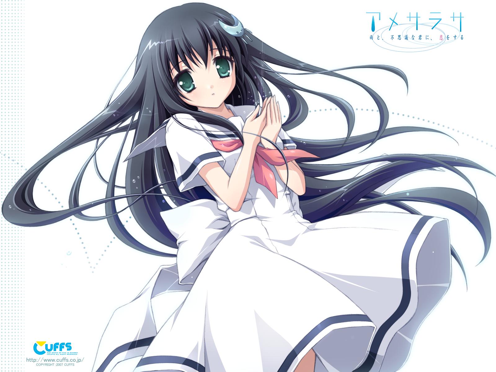 Description: A girl with long black hair and a white dress is holding her hands together and looking at the camera.