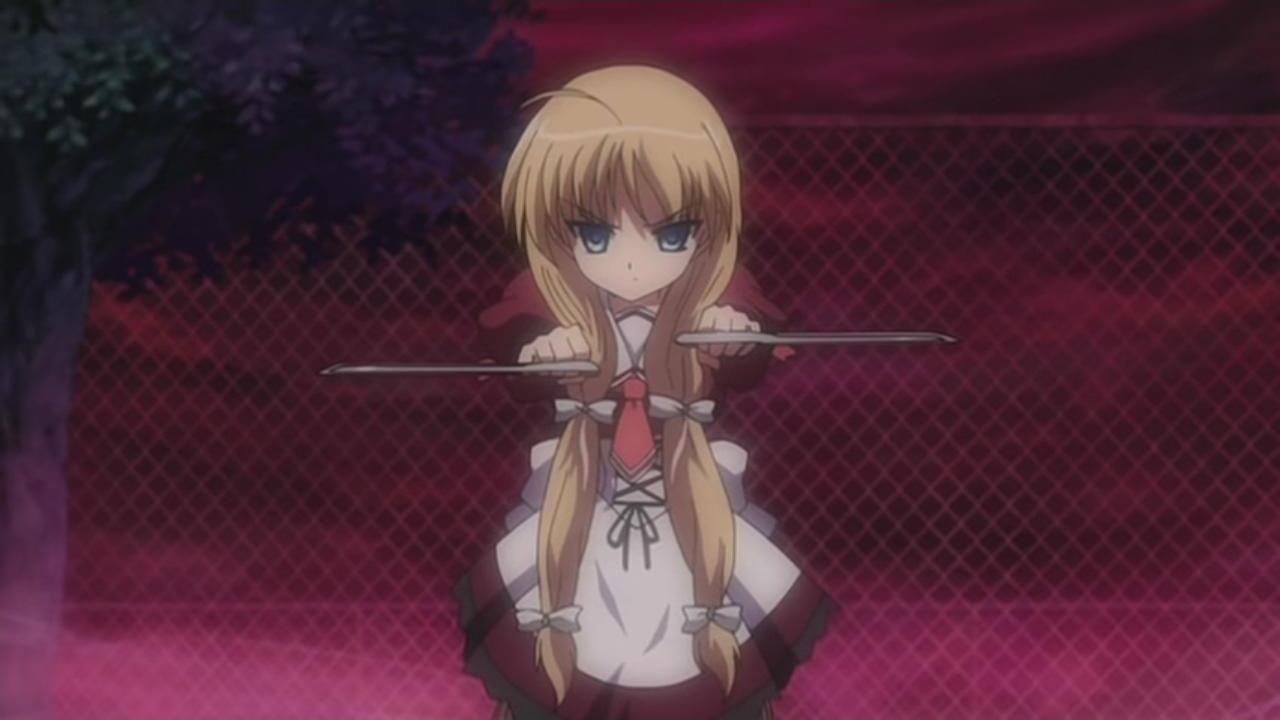 Description: A girl with long blonde hair holding a sword in front of a fence with trees in the background and a pink sky.