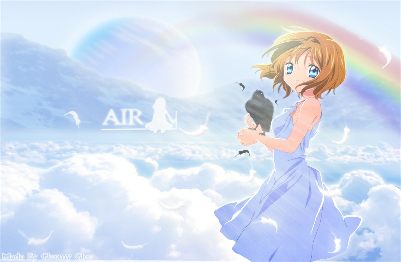 Description: A girl in a blue dress holding a black object in the clouds with a rainbow in the background and a rainbow in the sky.