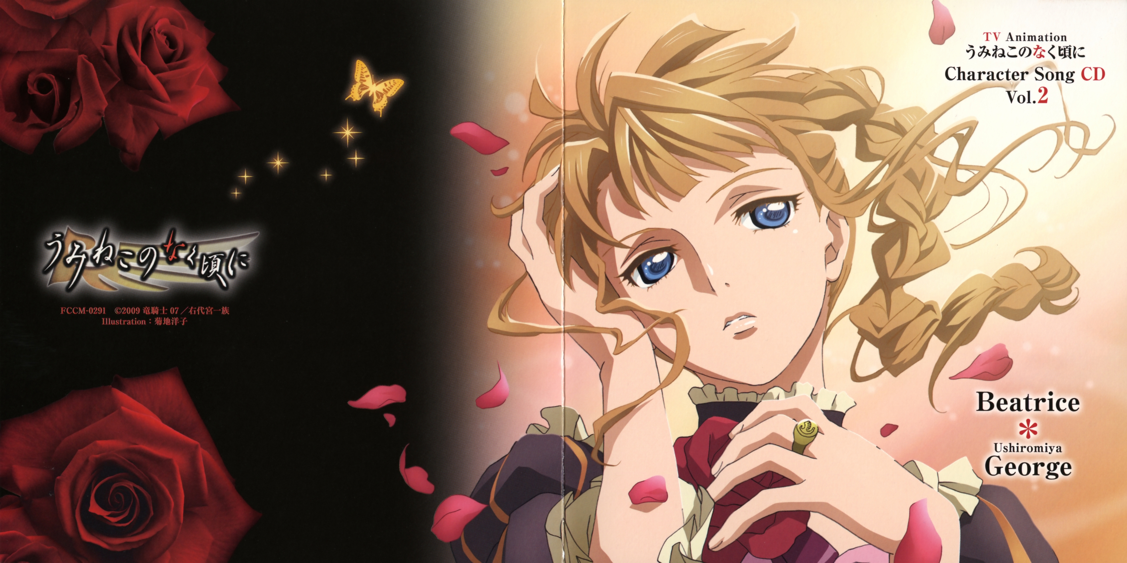 Description: A girl with blue eyes and blonde hair is looking at a rose and a butterfly is flying above her.