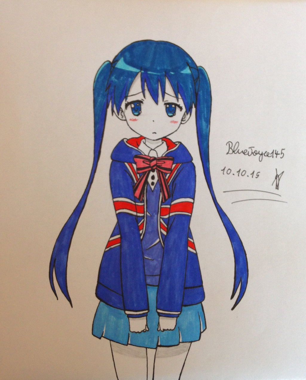 Description: A drawing of a girl with blue hair and a bow tie and a blue dress with a red and white stripe.