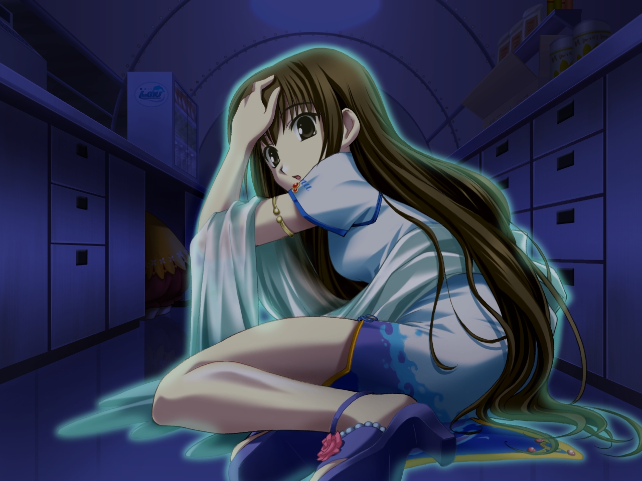 Description: A girl sitting on the floor in a room with a blue background and a blue light shining on her.