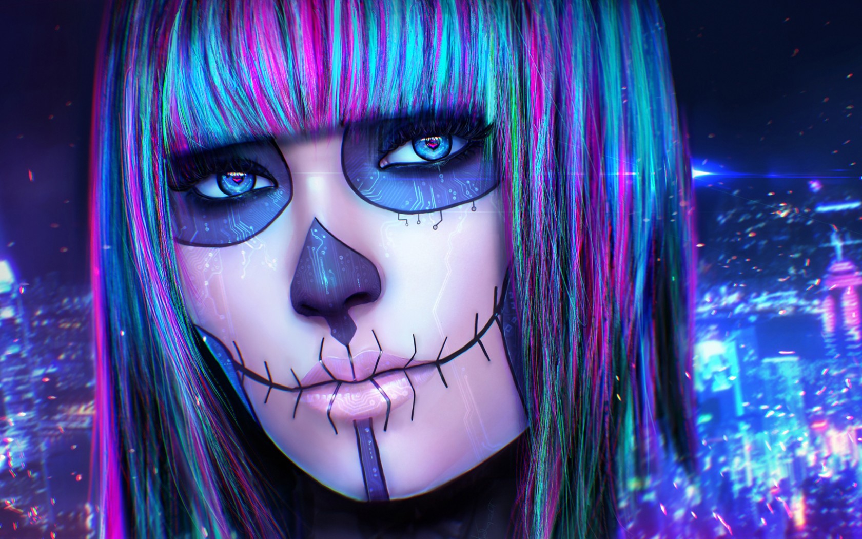 Description: A girl with blue and pink hair and a skull face paint job on her face and a city skyline in the background.