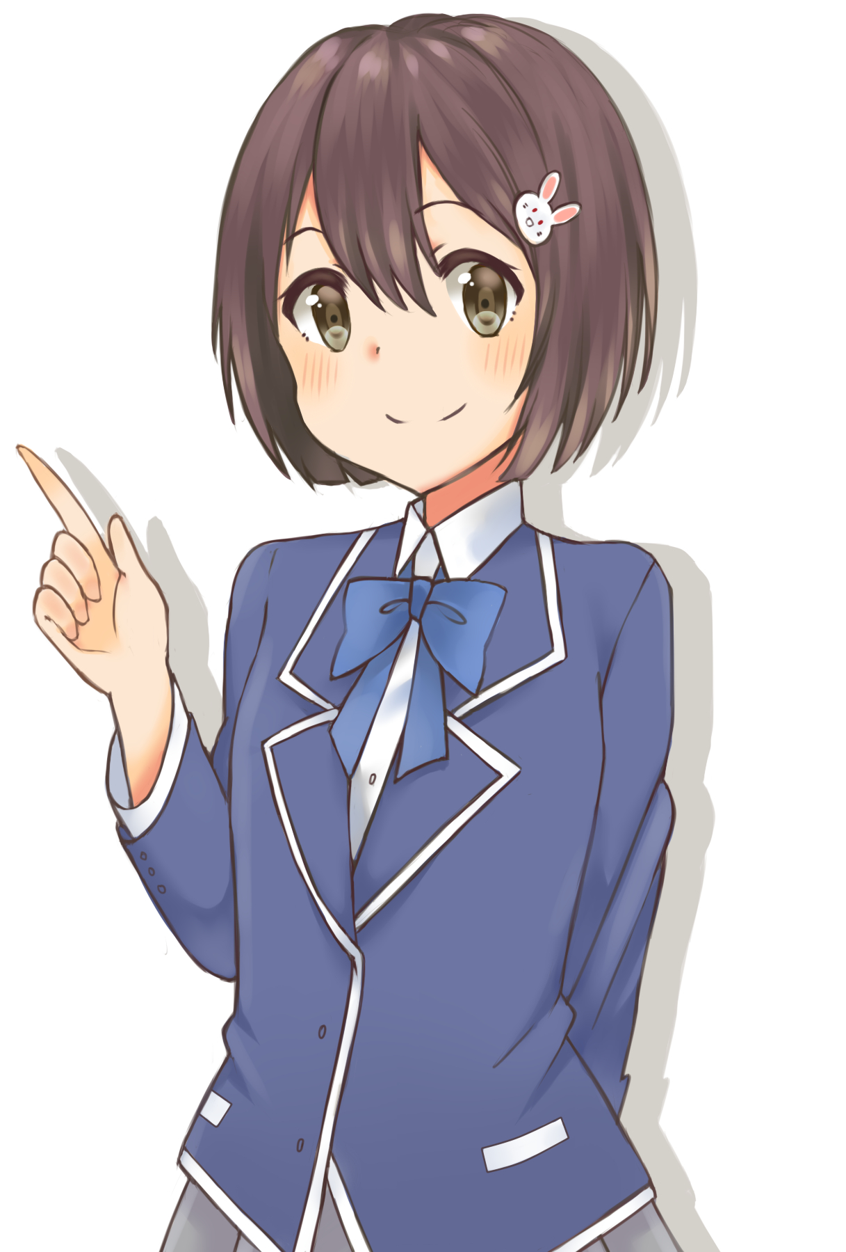 Description: A drawing of a girl in a blue suit with a bow tie and a butterfly on her head.