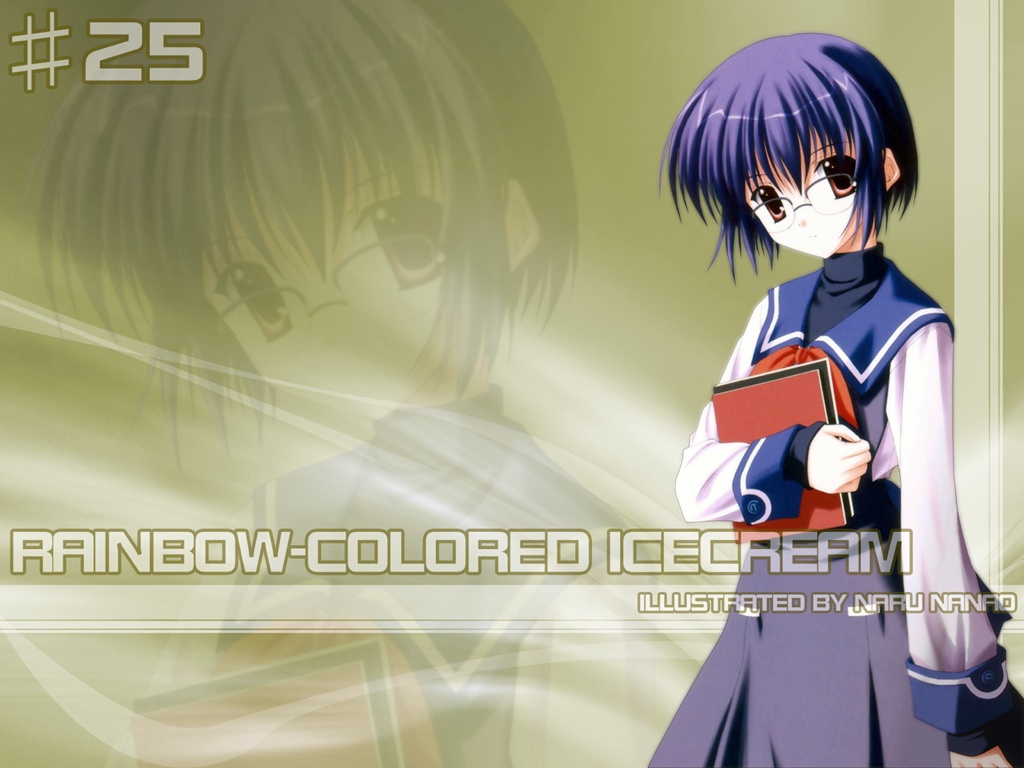 Description: A girl in a dress holding a book in her hands and a green background with the words rainbow colored ice cream.