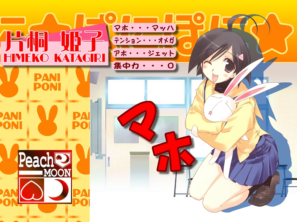 Description: A girl sitting on a chair holding a book in her hands and a sign reading peach moon on the wall.