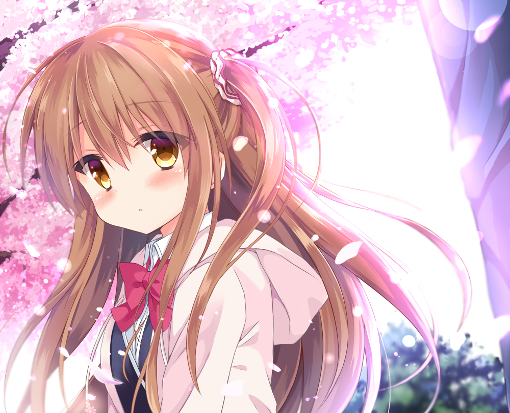 Description: A girl with long hair and a bow tie standing in front of a tree with pink flowers and leaves.