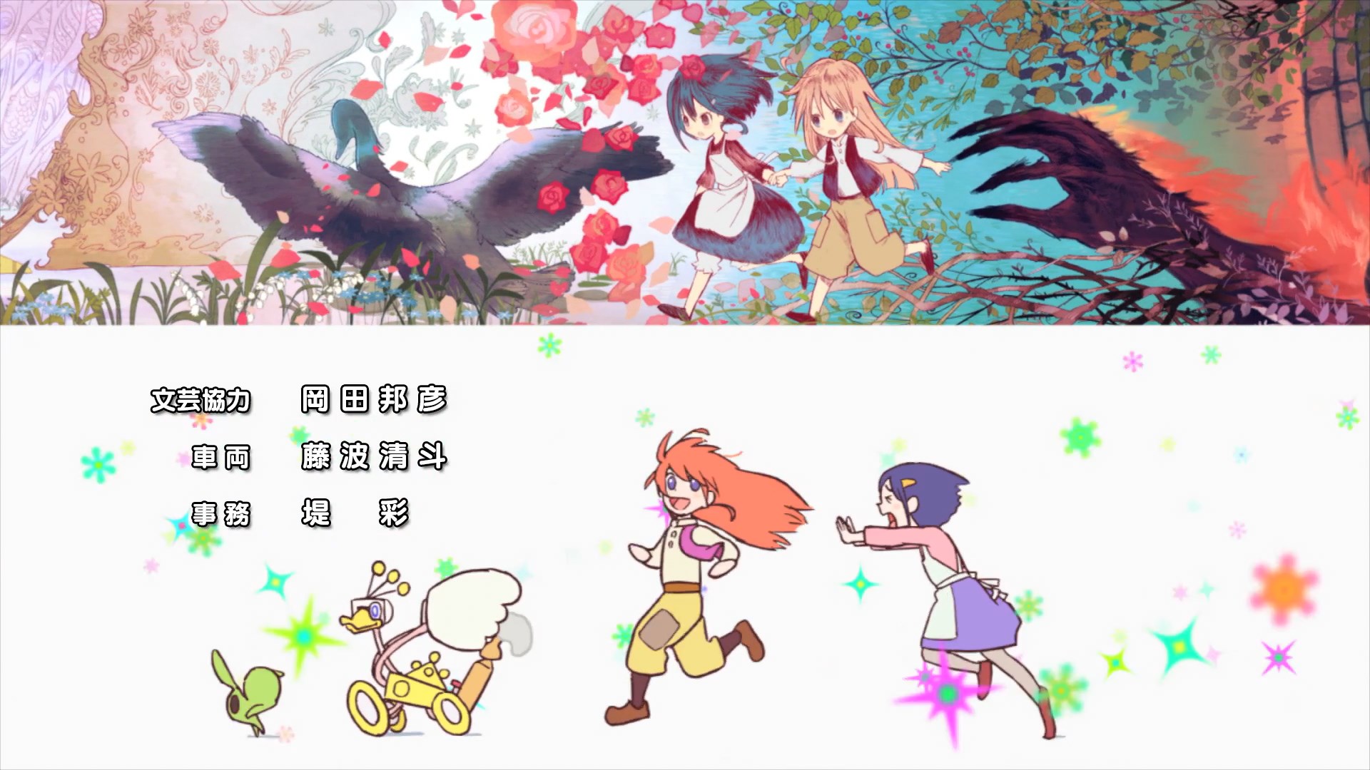 Description: A cartoon scene with a girl and a boy running and a bird flying over her head and a cartoon character with a dog.