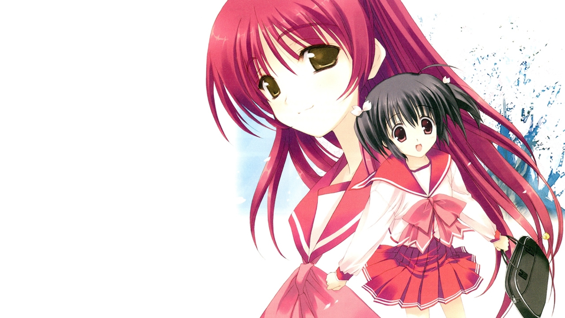 Description: A girl and a boy are standing together in front of a white background with blue sprays and a pink hair.
