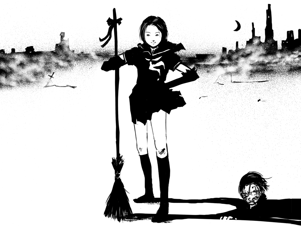Description: A black and white drawing of a girl holding a broom and a broom duster in front of a city.