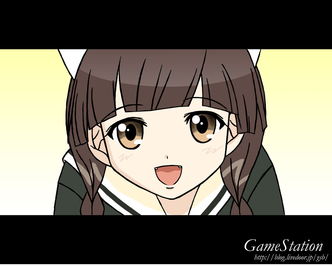 Description: A girl with long hair and a cat ears on her head is making a funny face with her eyes wide open.