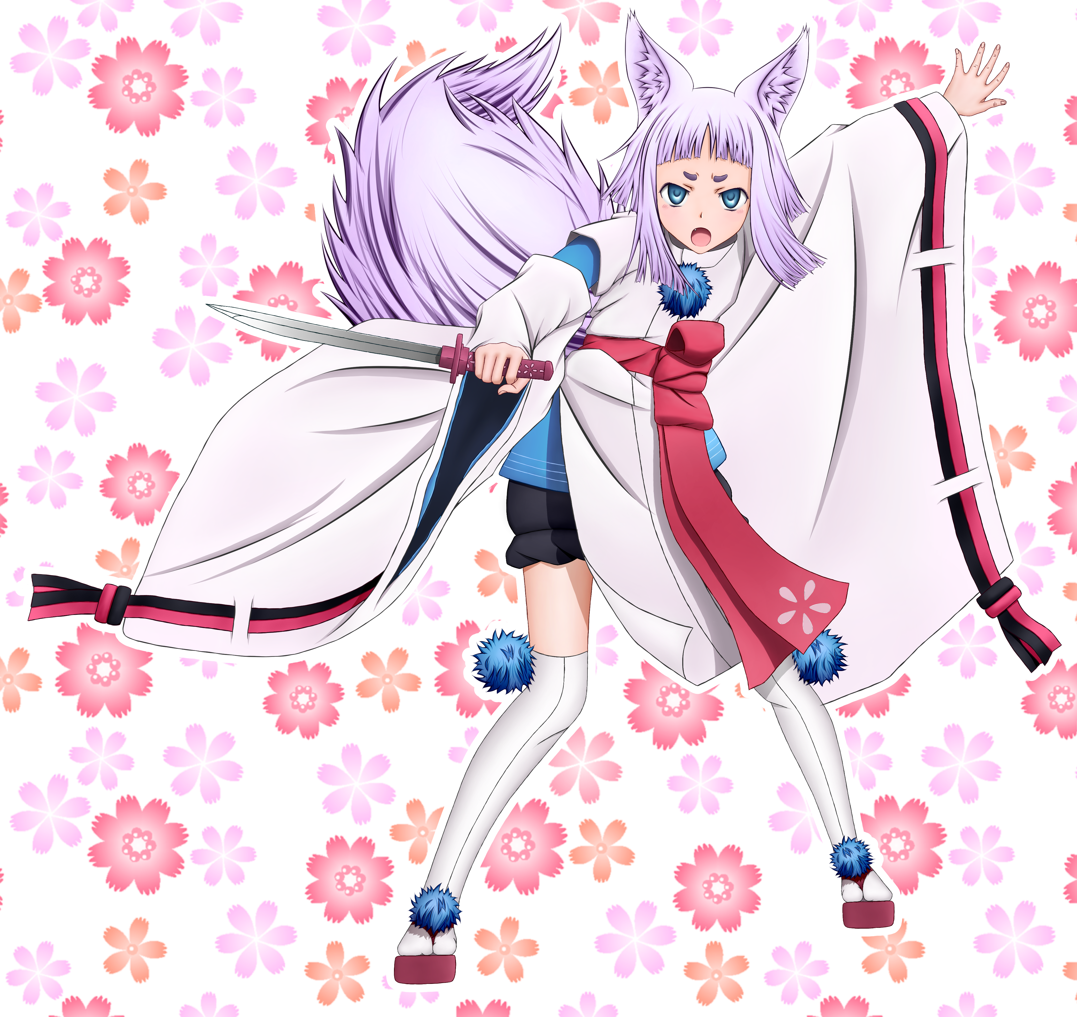 Description: A girl with a cat ears and a scarf around her neck is holding a sword and a flower background.