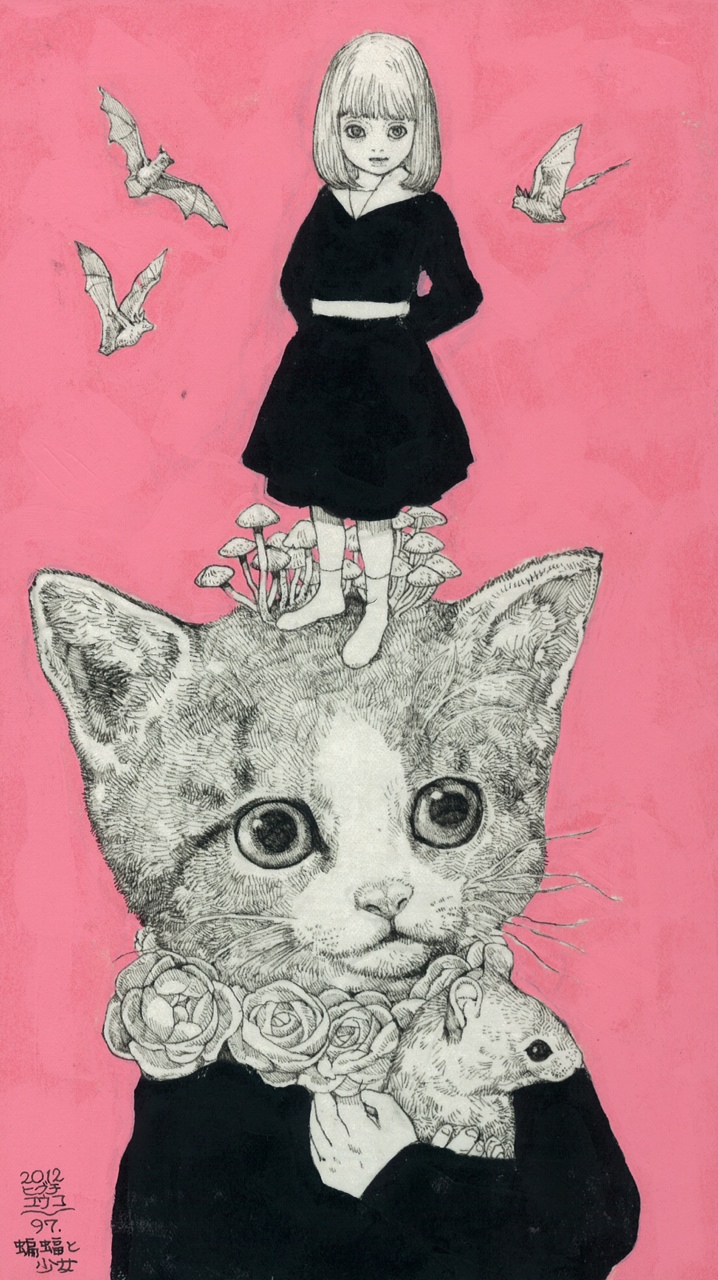 Description: A drawing of a girl in a black dress and a cat with a rose collar and a bird on her shoulder.