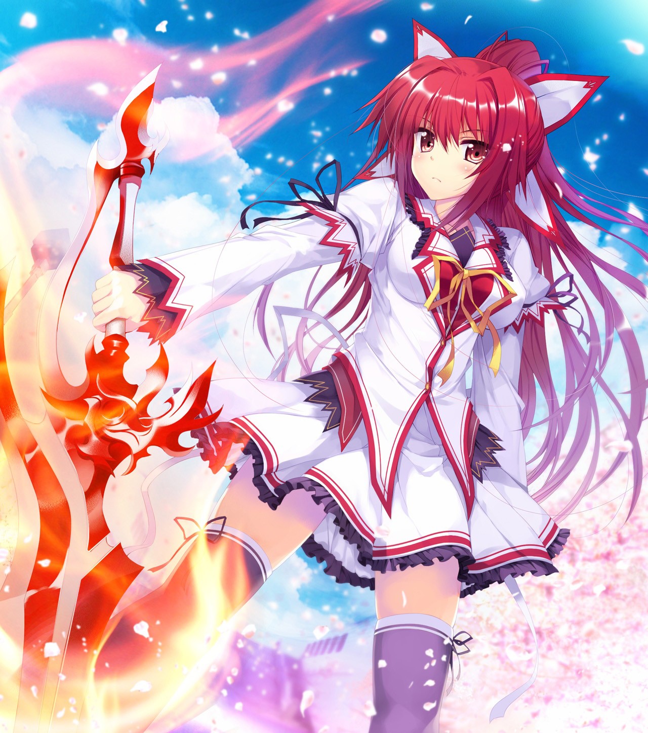 Description: A girl in a white dress and a cat ears outfit holding a sword in front of a fire and snow background.