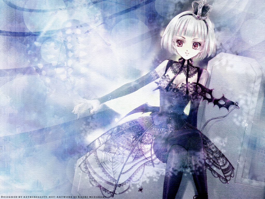 Description: A girl in a dress with a cat on her head and wings on her head.