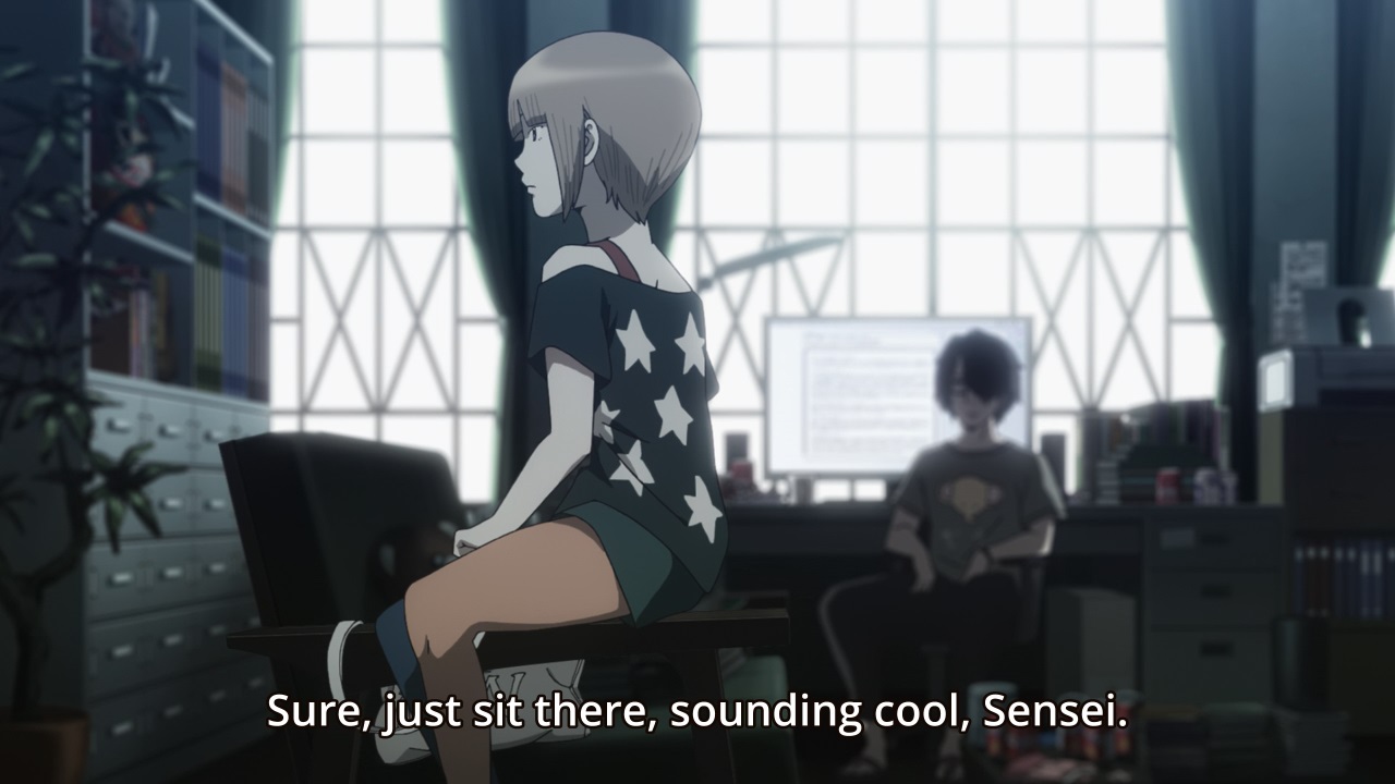 Description: A girl sitting in a chair in a room with a window and a man standing behind her with a computer on the desk.