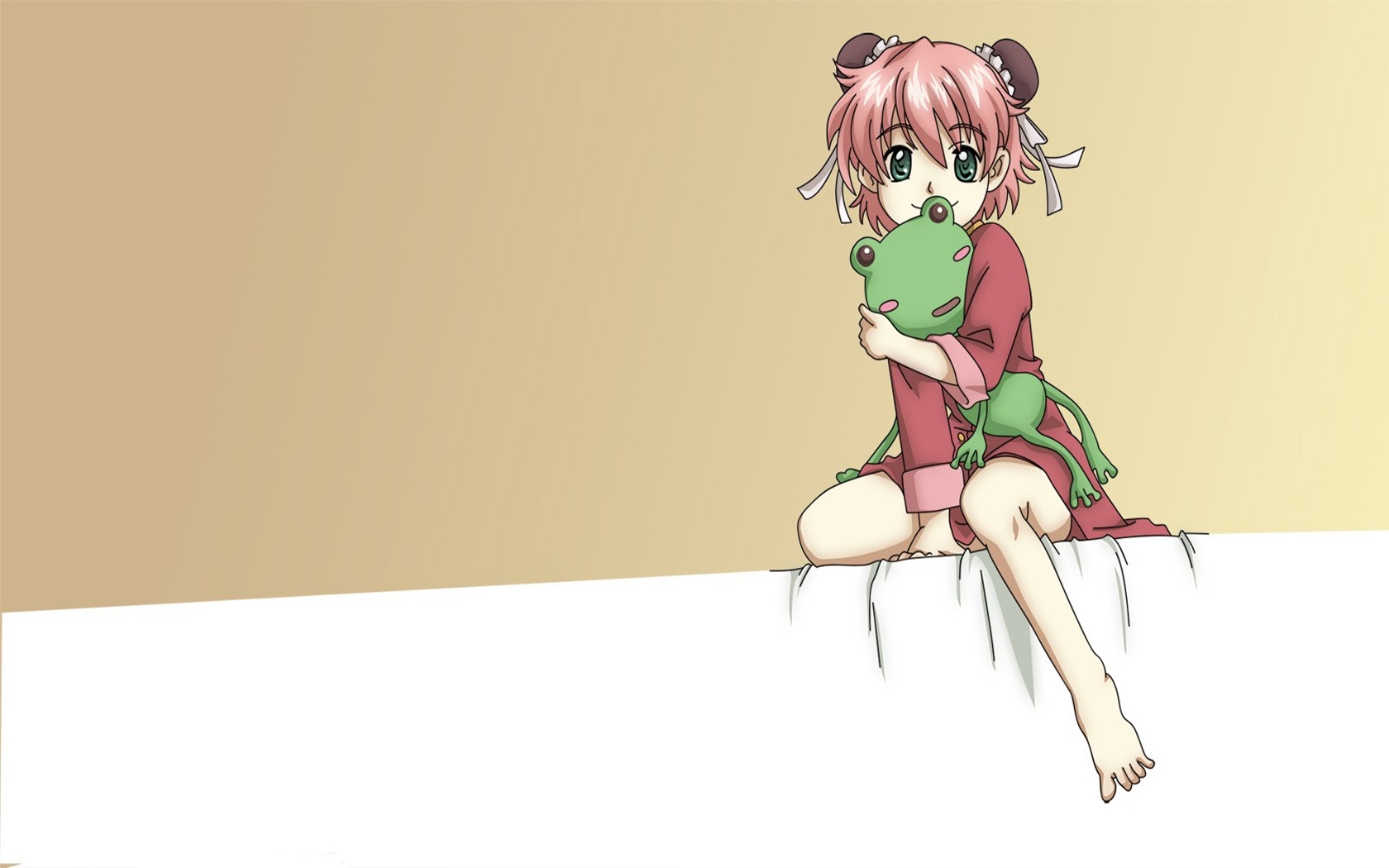 Description: A girl sitting on a ledge holding a stuffed animal in her hands and a green teddy bear in her hand.