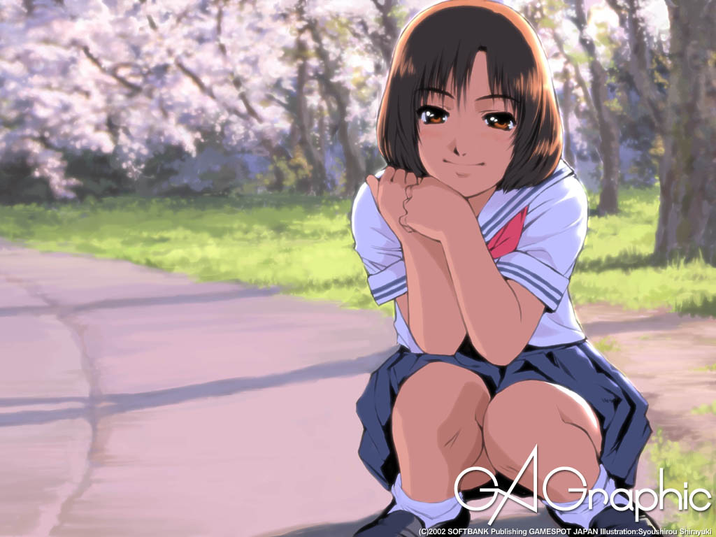 Description: A girl sitting on a bench in a park with cherry blossoms in the background and a tree with white blossoms.