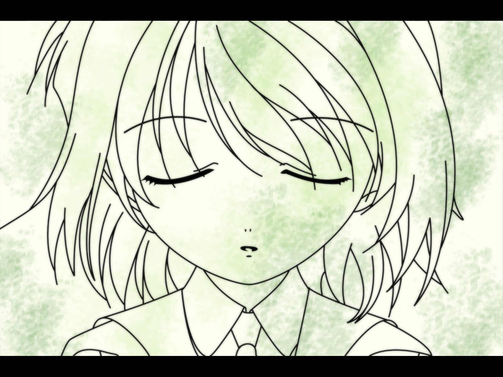 Description: A drawing of a girl with eyes closed and a tie on her neck and a green background with a white spot.