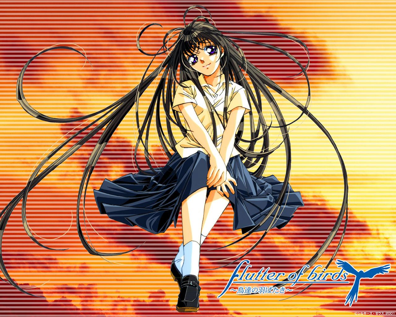 Description: A girl with long hair sitting on a cloud background with her hair flying in the air and her eyes closed.