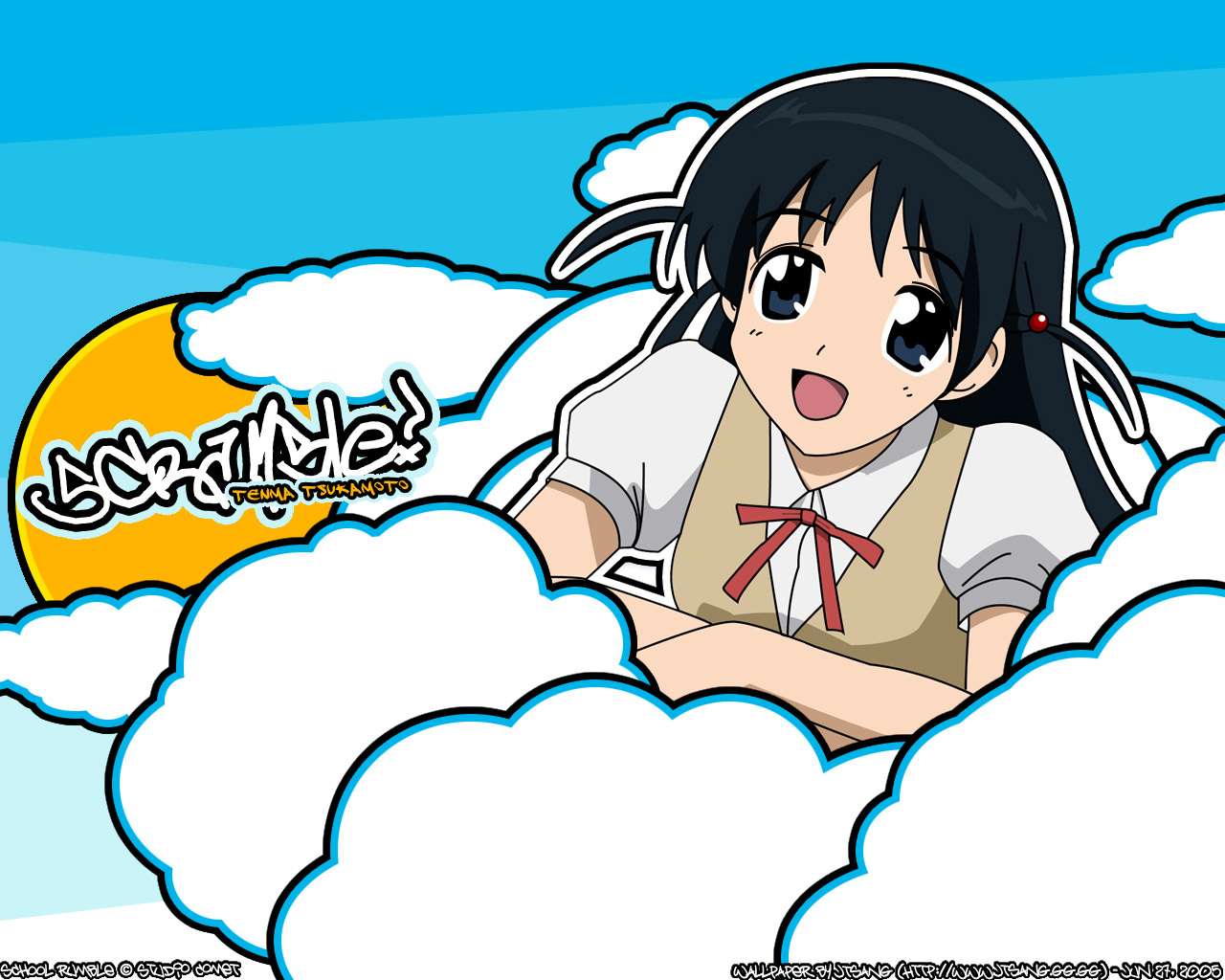 Description: A girl sitting on a cloud with a sun in the background and a sky with clouds and sun in the background.