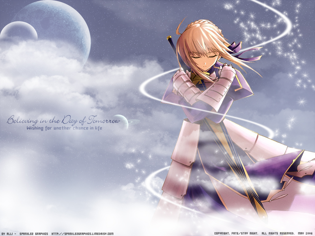 Description: A girl in a dress is standing in the clouds with a sword in her hand and a moon in the background.