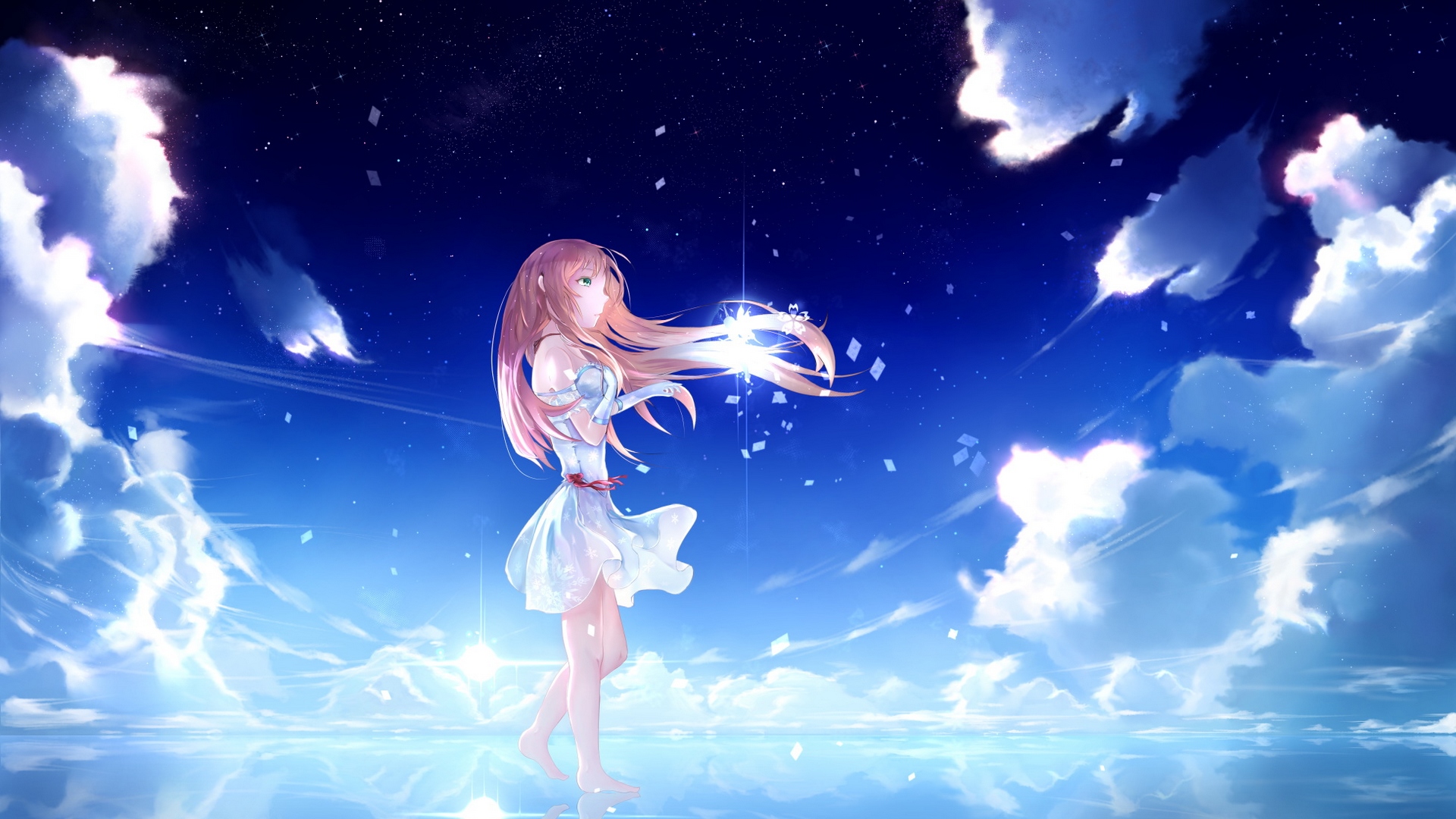 Description: A girl standing on a cloud filled sky with a star in her hand and a light shining in her hand.
