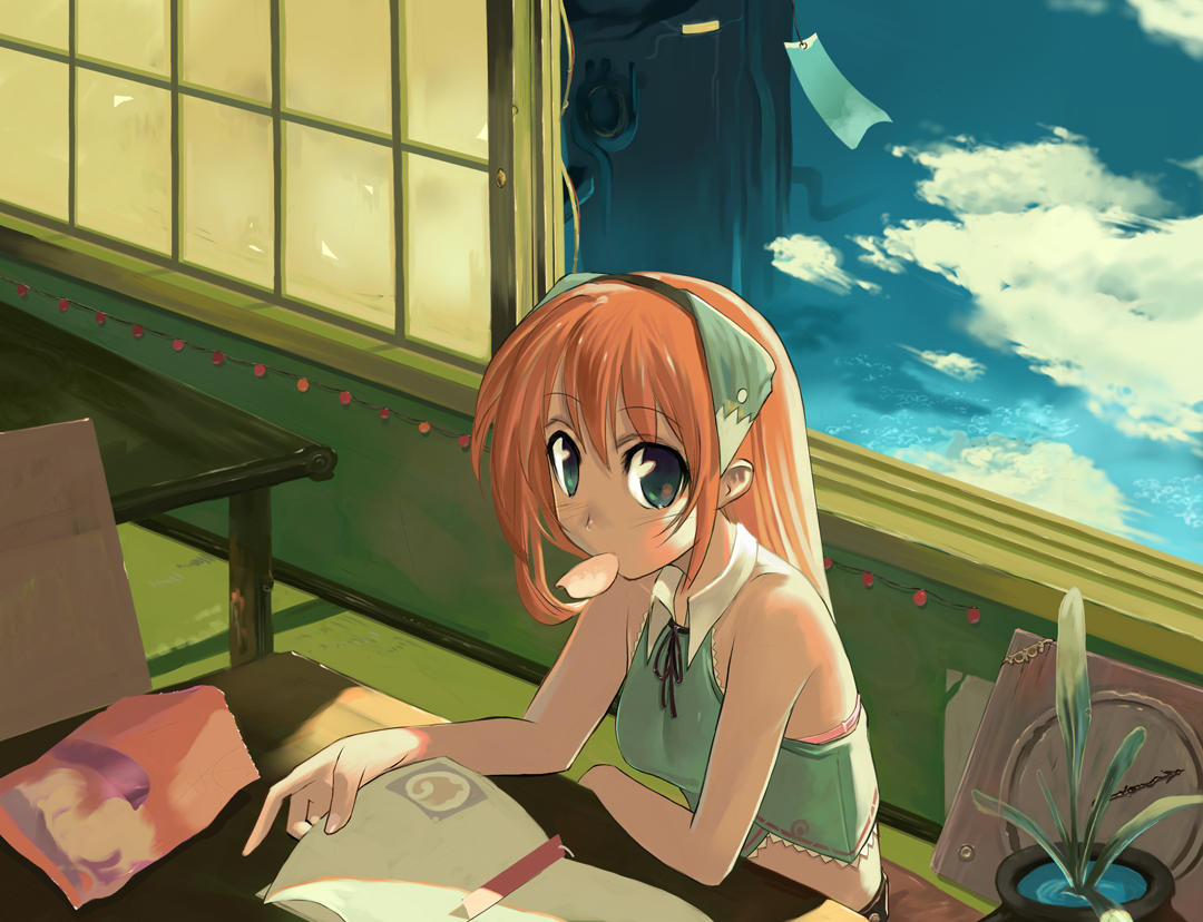 Description: A girl sitting at a table with a book and a cup of coffee in front of her.
