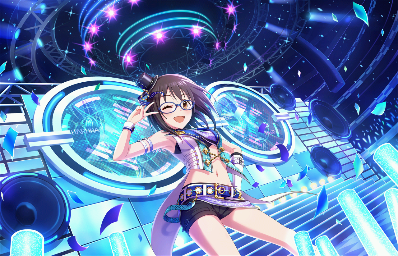 Description: A girl in a short skirt and glasses is dancing in a disco scene with a microphone and speakers in her hand.