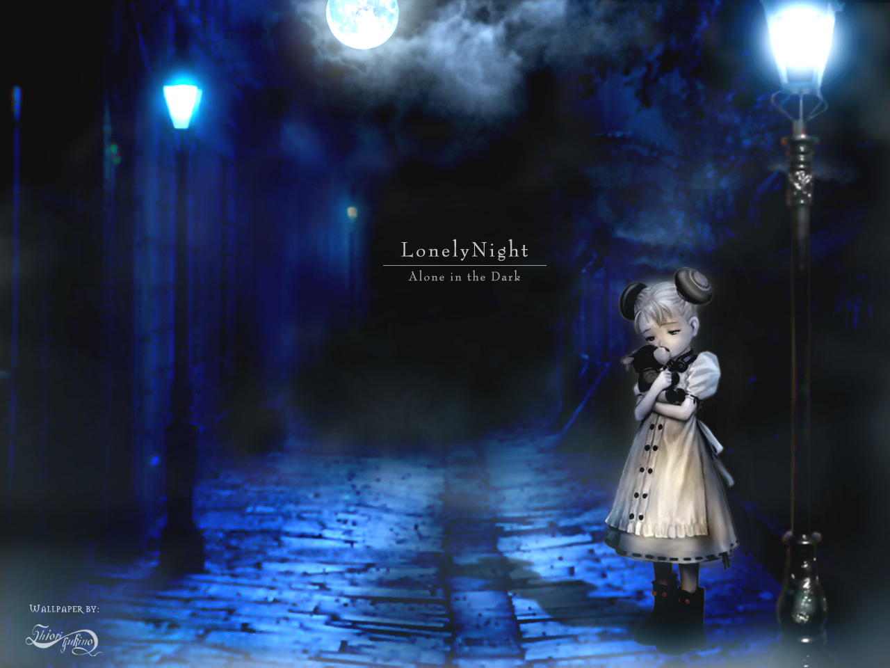 Description: A girl in a dress standing in a dark alley with a lamp post in the background and a full moon in the sky.