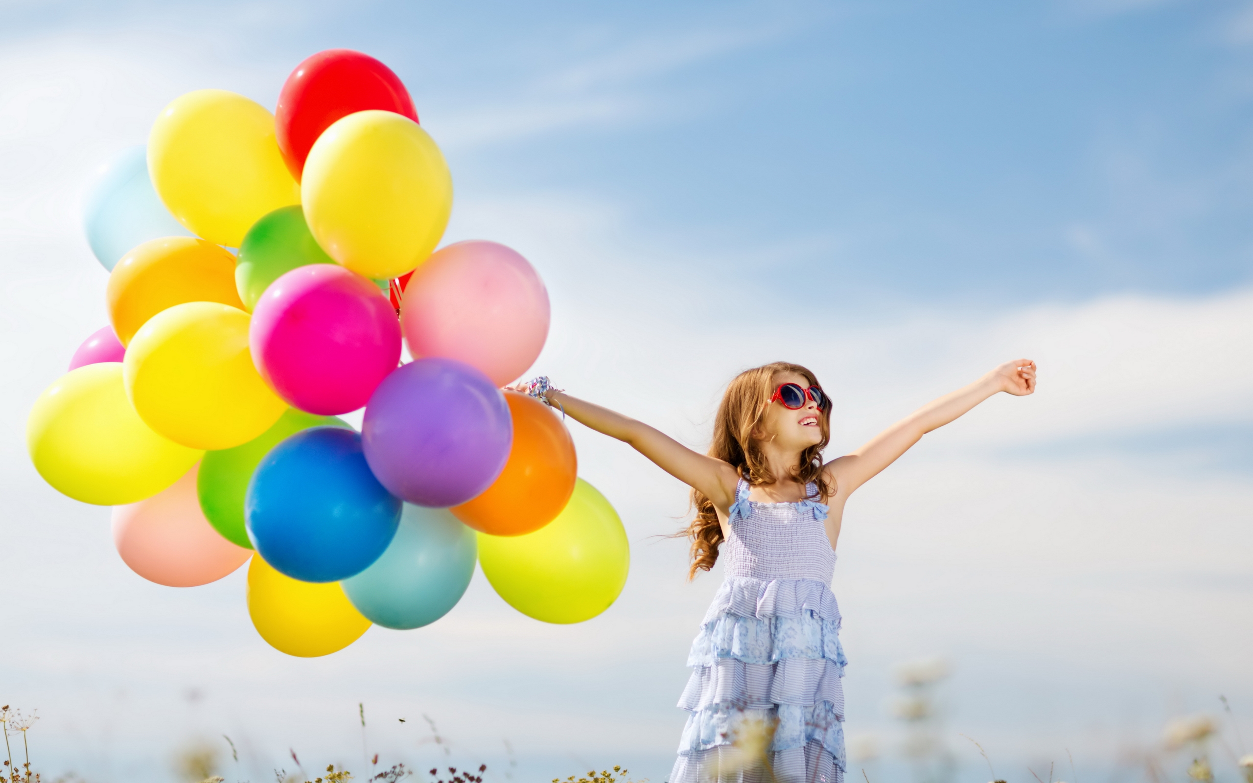 Description: A girl in a dress holding a bunch of balloons in a field of flowers with her arms outstretched in the air.