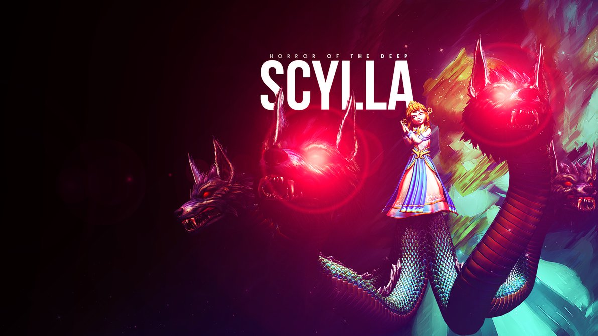 Description: A girl in a dress and a dragon in a dark background with the words scylla on it.