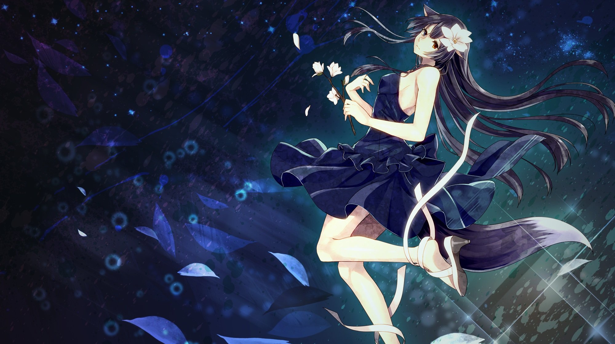 Description: A girl in a dress holding a flower in her hand and flying through the air with a blue background.