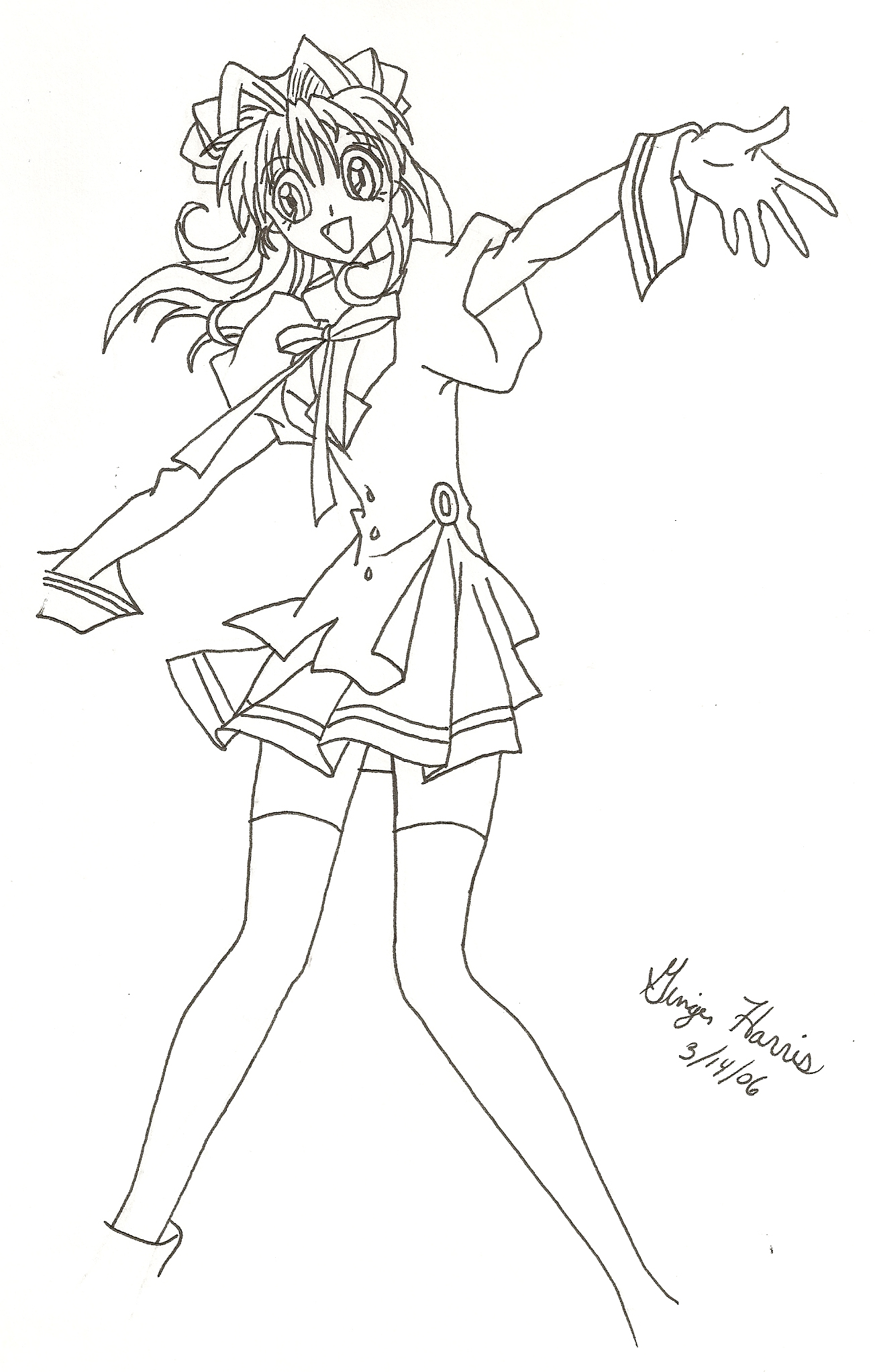 Description: A drawing of a girl in a dress and hat with her arms outstretched and hands out.