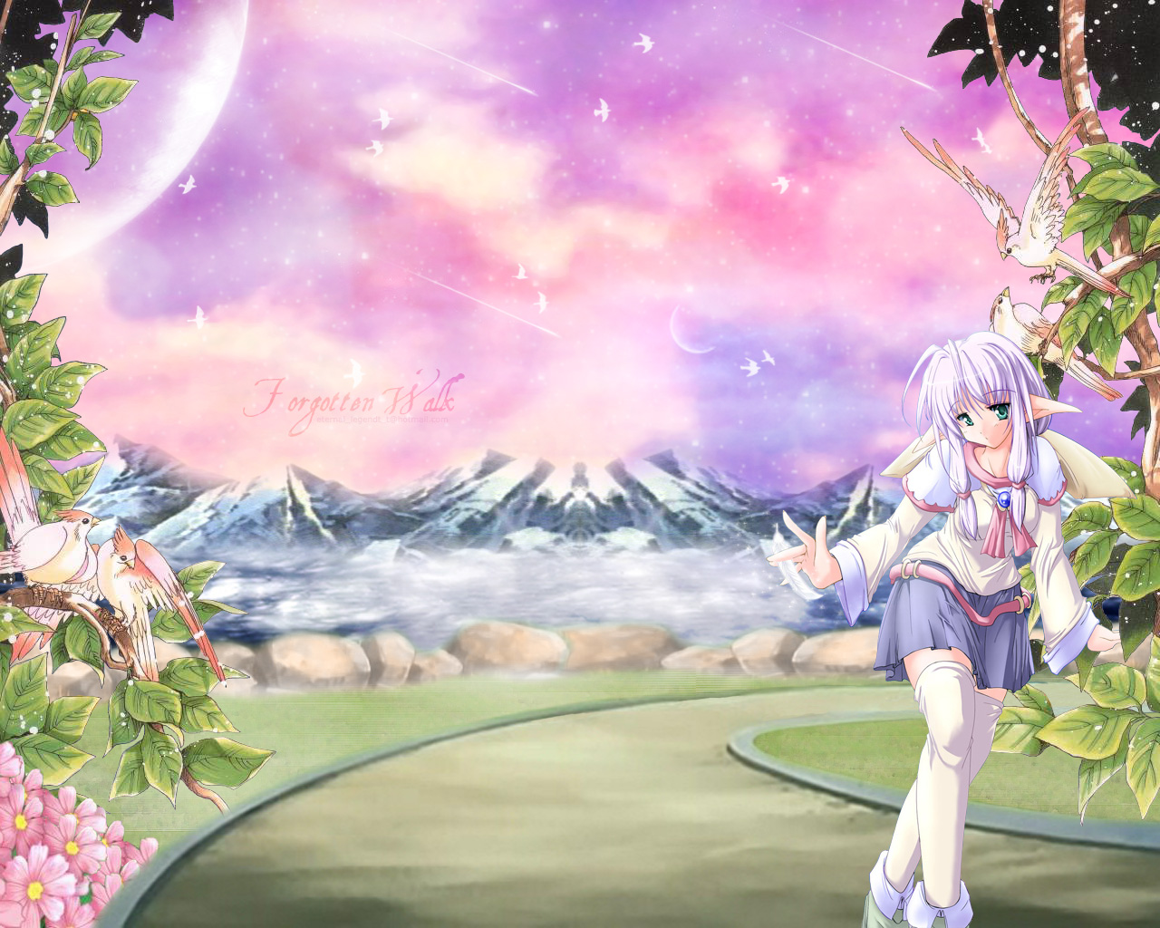 Description: A girl walking down a path in a field with flowers and a mountain in the background with a pink sky.