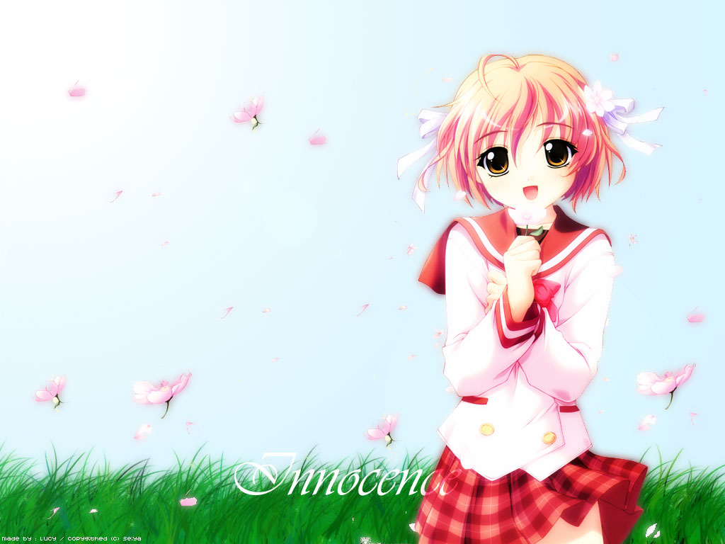Description: A girl in a dress standing in a field with flowers in her hair and a flower in her mouth.