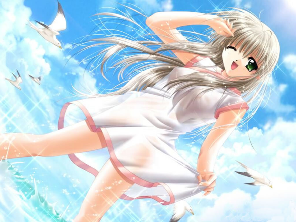Description: A girl in a white dress flying through the air with birds around her and a blue sky with clouds.