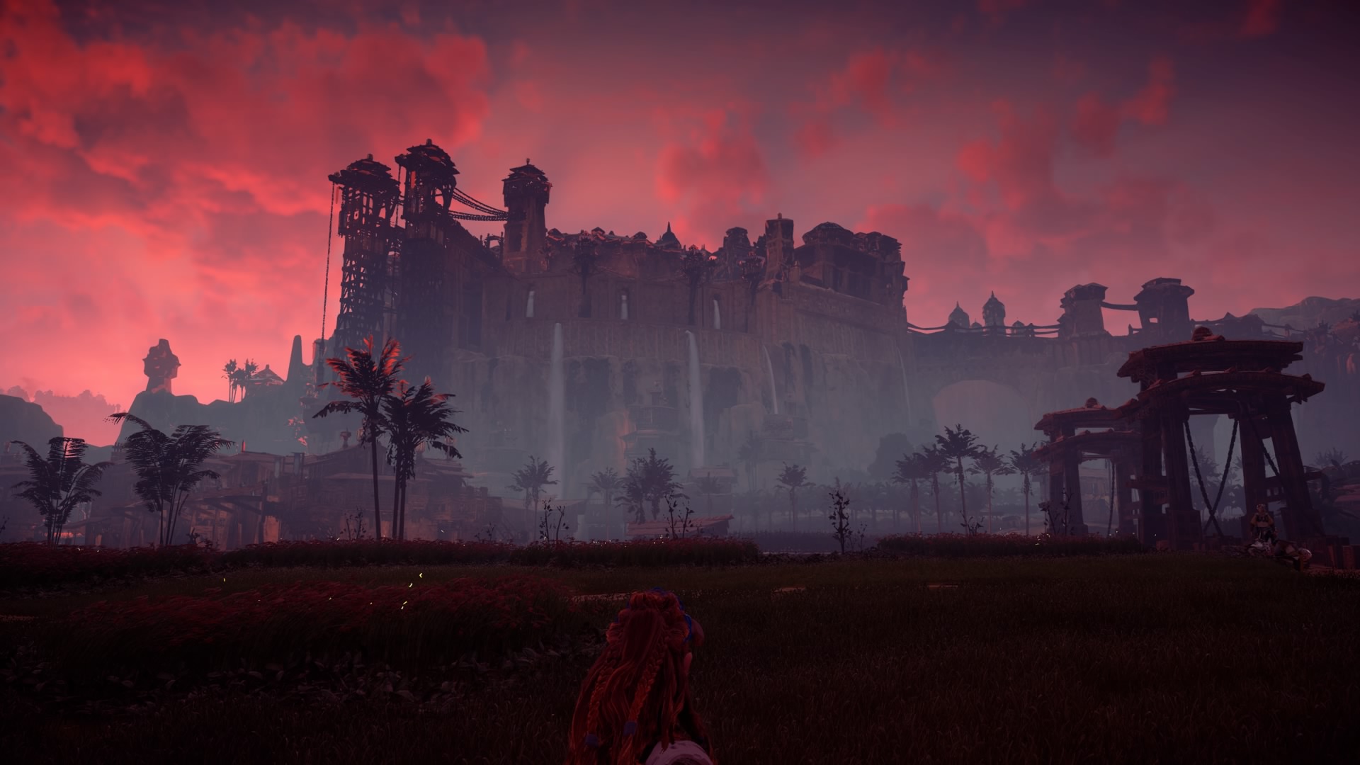 Description: A girl standing in front of a giant building with a giant clock tower in the background at sunset or dawn.