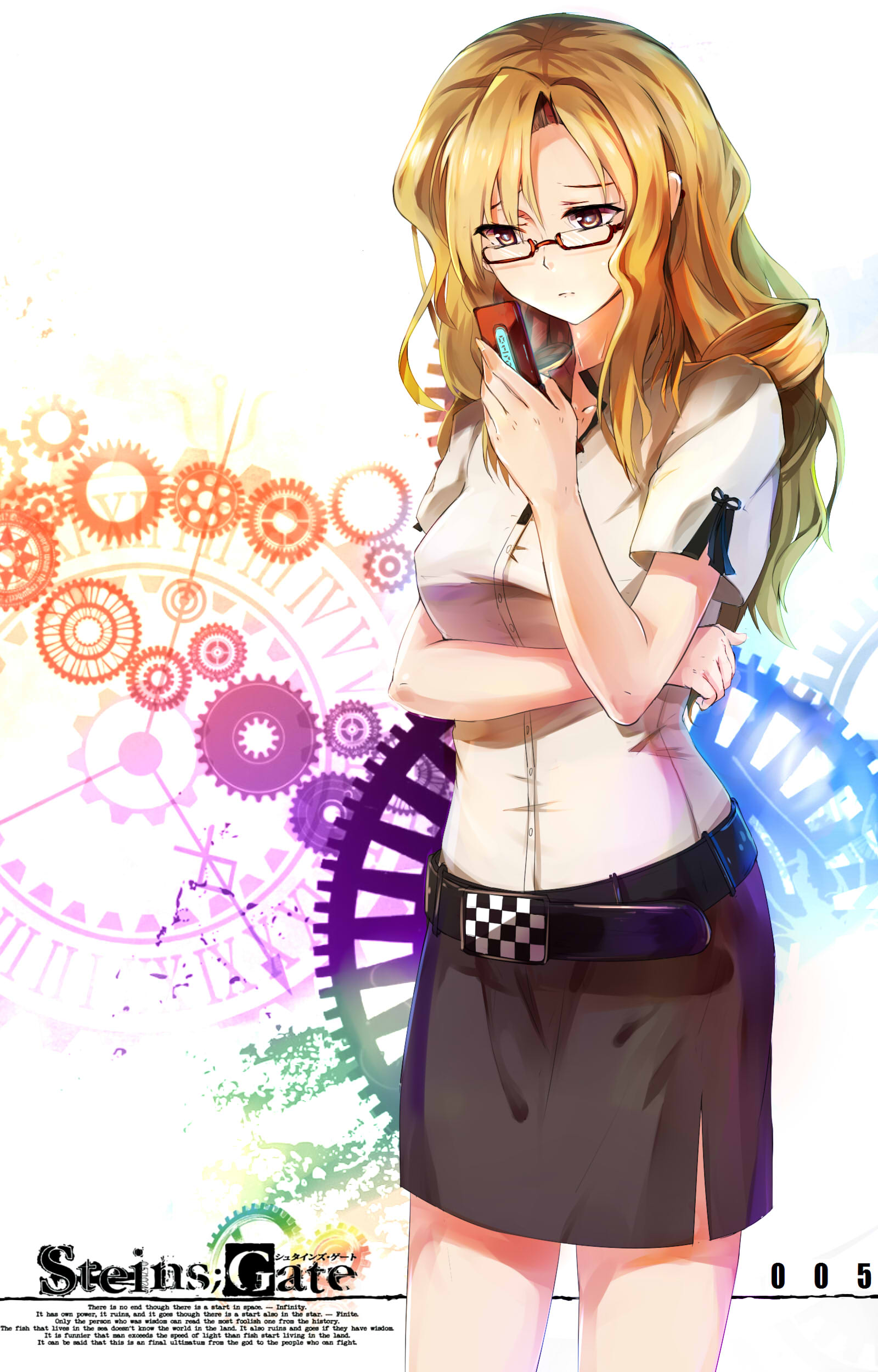 Description: A girl in a skirt and glasses is holding a cell phone in her hand and looking at the camera.