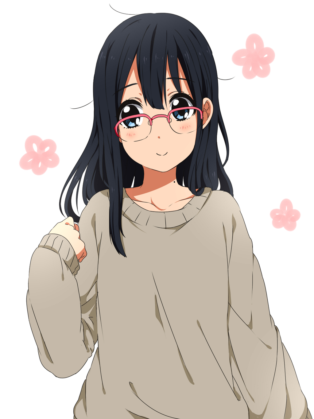 Description: A girl with glasses and a sweater on is posing for a picture with flowers in the background and a pink flower in the foreground.
