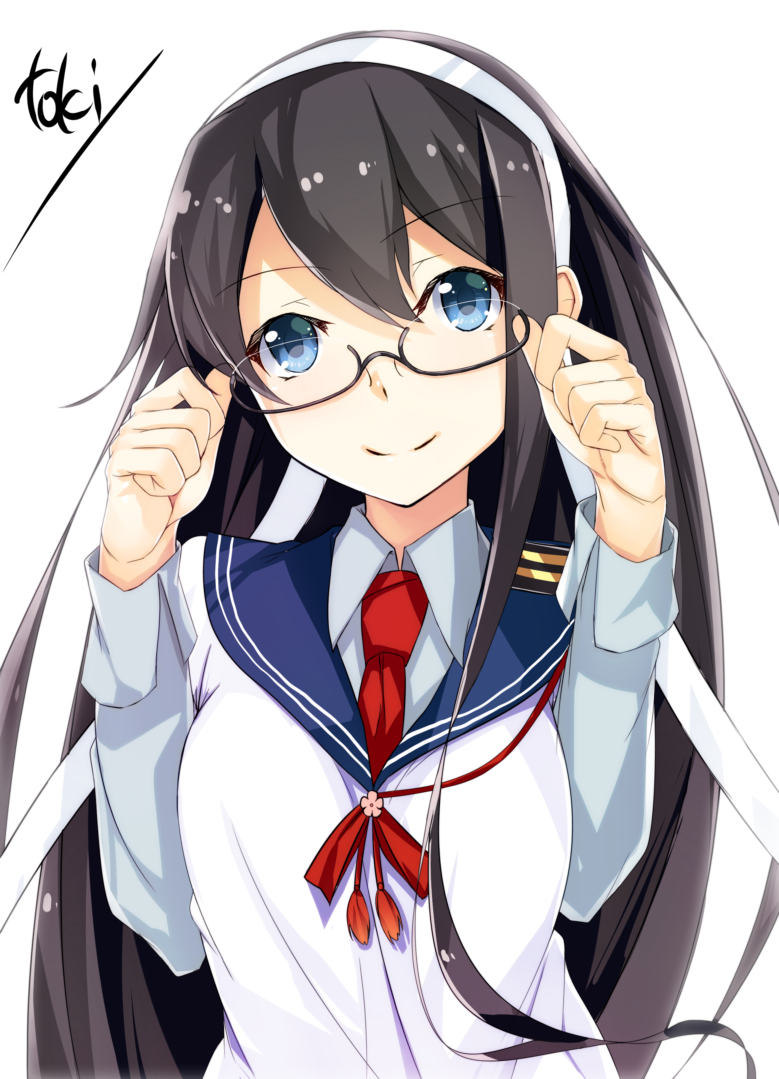 Description: A girl with glasses and a tie is posing for a picture with her hands on her head and her hair in a ponytail.