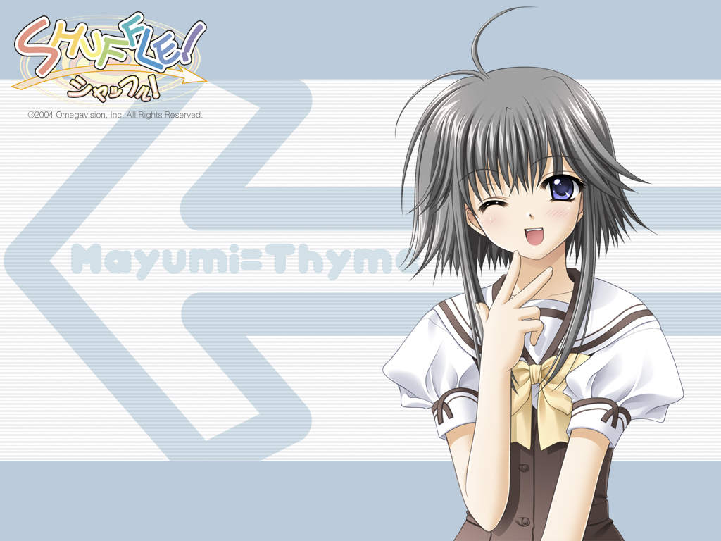 Description: A girl with a short gray hair and a white shirt is standing in front of a blue and white background.