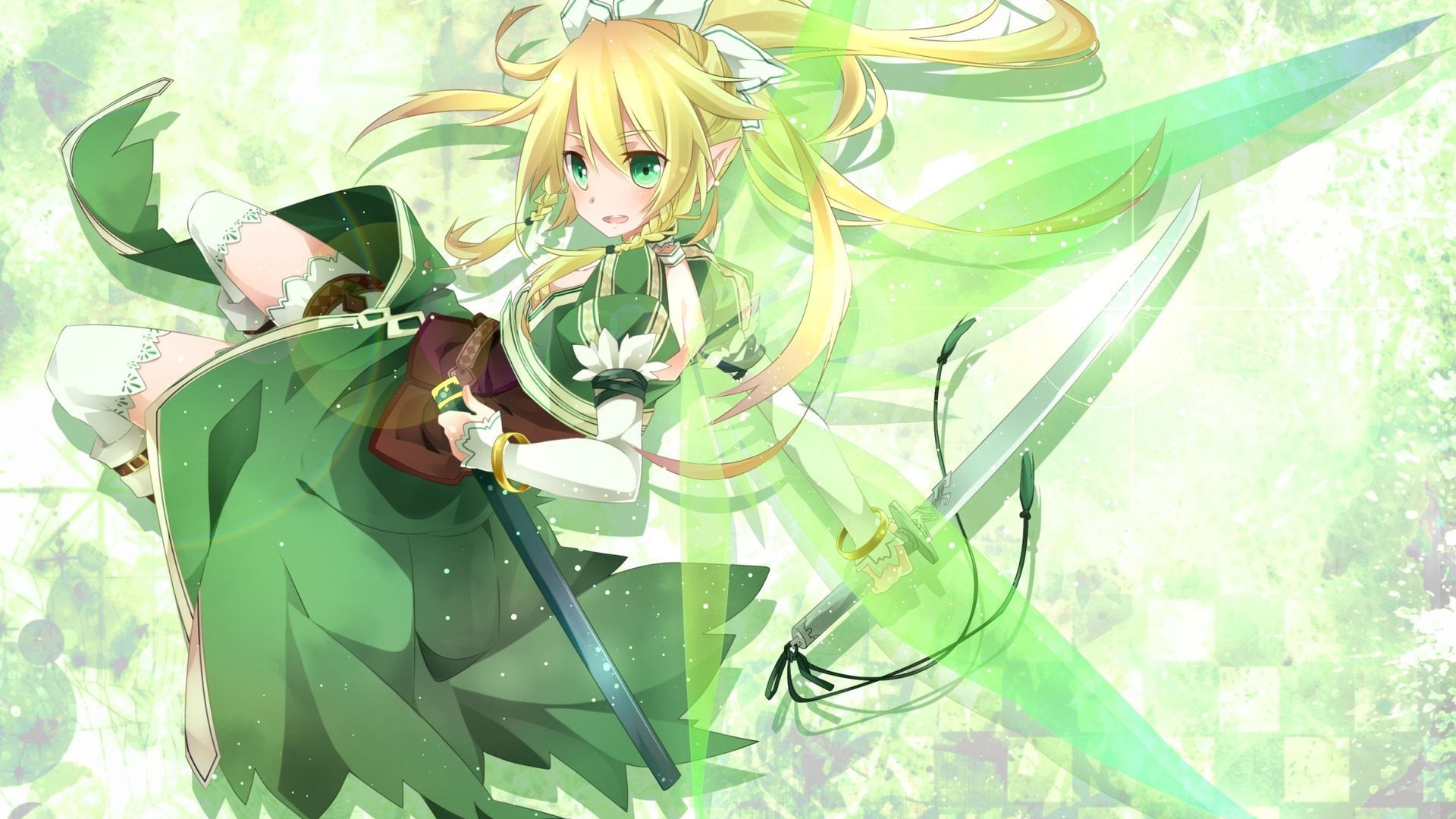 Description: A girl in a green dress holding a sword and a sword in her hand.