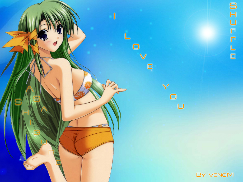 Description: A girl in a bikini with long green hair and a bow in her hair.