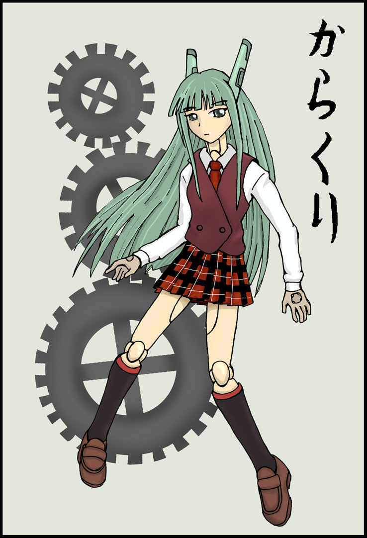 Description: A girl in a school uniform with long hair and a green wig is standing in front of a gear wheel.