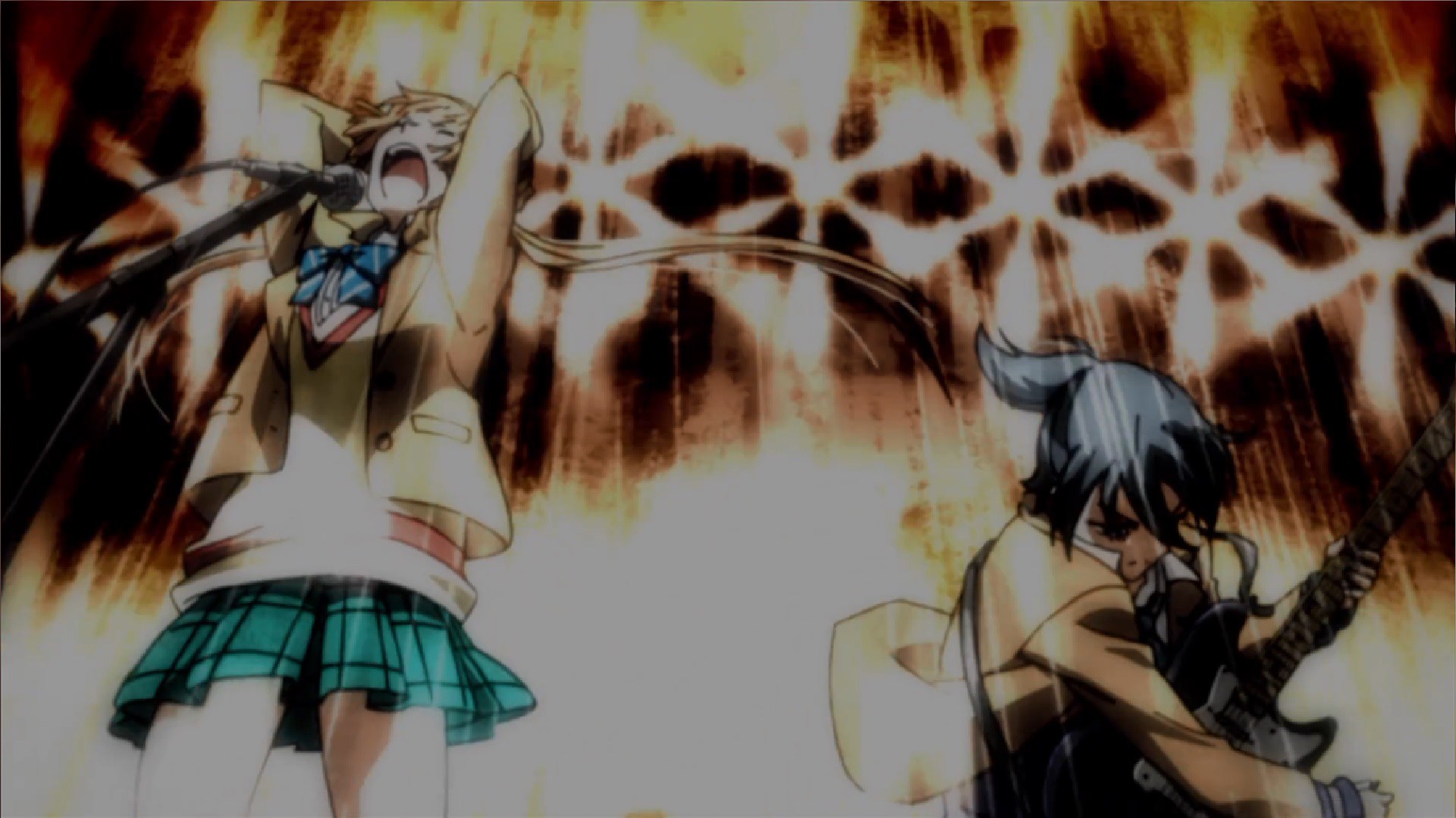 Description: A girl with a guitar and a guy with a guitar in front of her with a cat on his shoulder.