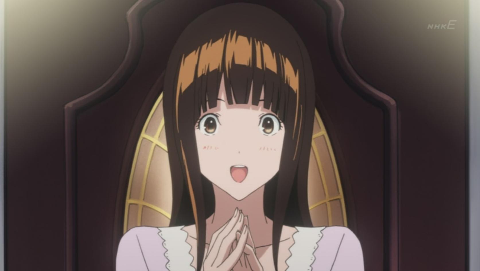 Description: A girl with her hands folded in front of her face and a mirror behind her.