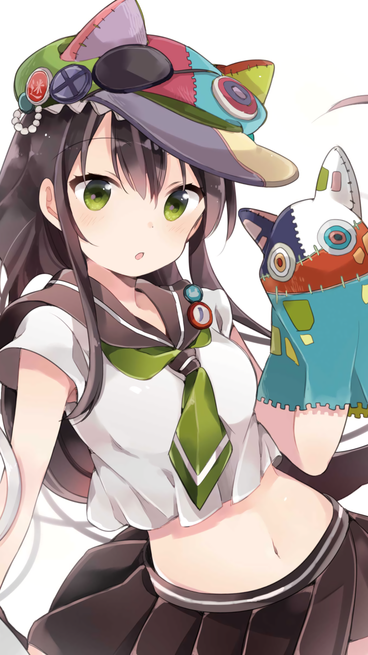 Description: A girl in a hat and dress holding a stuffed animal in her hand and a cat on her arm.