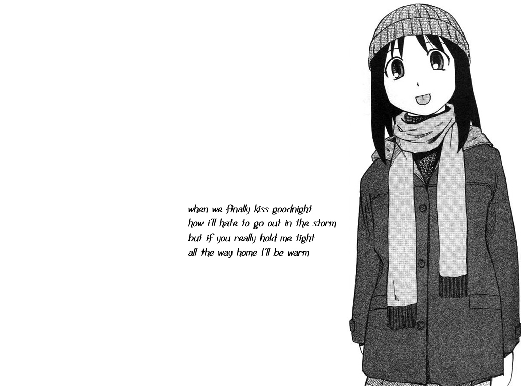 Description: A girl with a hat and scarf standing in front of a white background with a quote from the anime.
