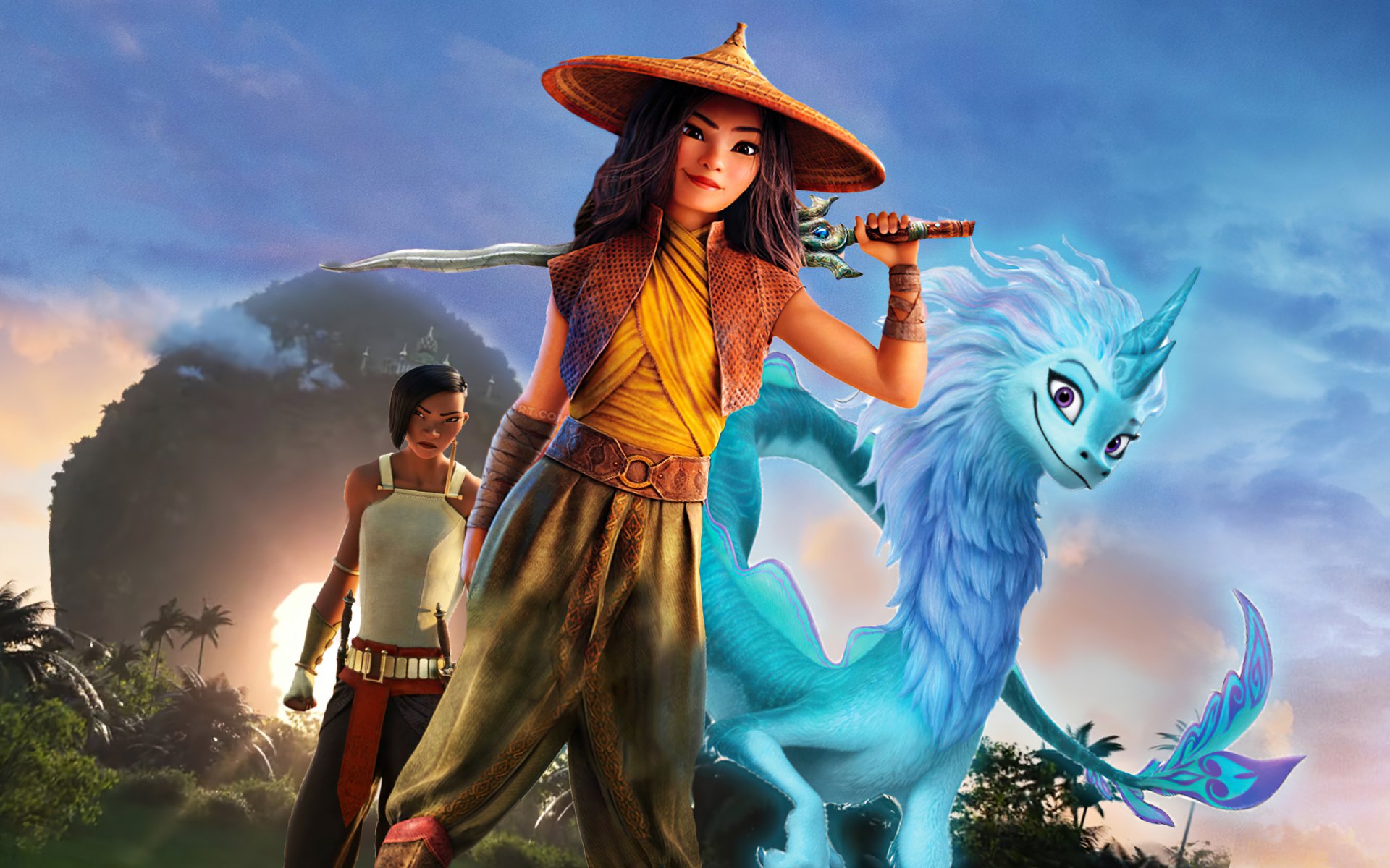 Description: A girl in a hat holding a sword next to a dragon and a man in a yellow shirt and hat.